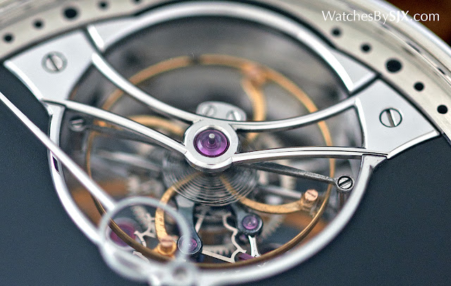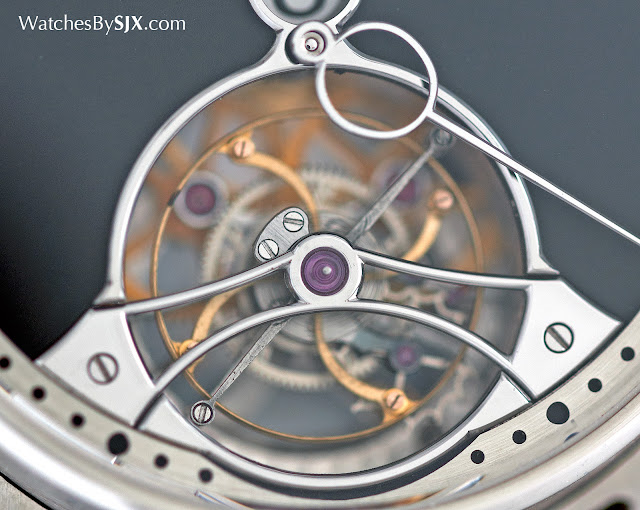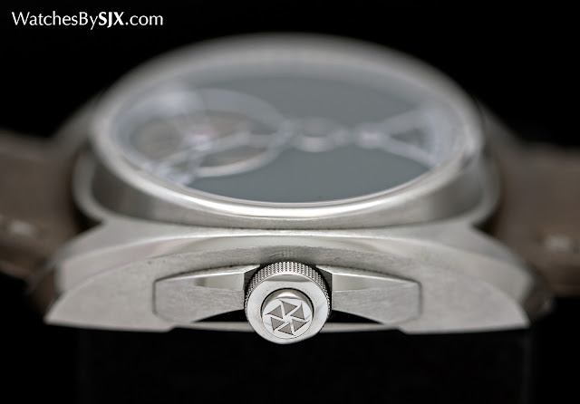 Le cadran est un gris foncé, avec une finition grainée unnervingly lisse. Cela se fait à la main, réalisé par polissage de la plaque de cadran avec un mélange d'huile et de la pierre abrasive en poudre. Toutes les parties en acier du cadran, comme les mains et les anneaux pour les ouvertures, sont polies avec des bords biseautés. Le détaillant est impressionnant.