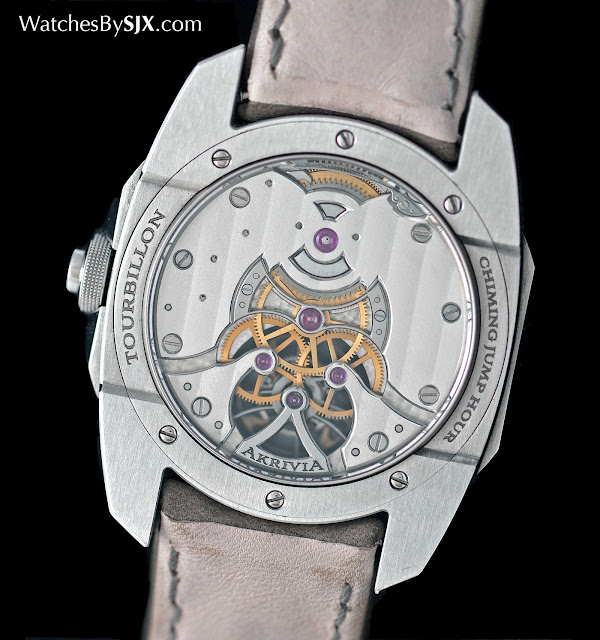 Les Akrivia plus compliquées introduites l' année dernière, le Tourbillon Chiming Jump Hour est un remontage manuel saut montre d' une heure avec un tourbillon, ainsi qu'un mécanisme de sonnerie pour un seul carillon au début de chaque heure. L'affaire est en acier inoxydable, 43 mm de diamètre et chunkily en forme. Bien que le cas est pas celui qui fera appel à ceux qui , comme un style traditionnel, il est bien fini, avec des biseaux polis qui sont destinés à évoquer le mouvement anglage .